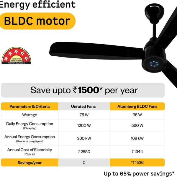 | Cost Savings | Saves up to ₹1500 per year on electricity bills compared to induction fans. |