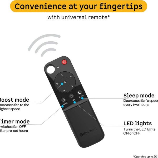 | Remote Features | Smart RF remote allows operation from any angle without pointing at the fan. |