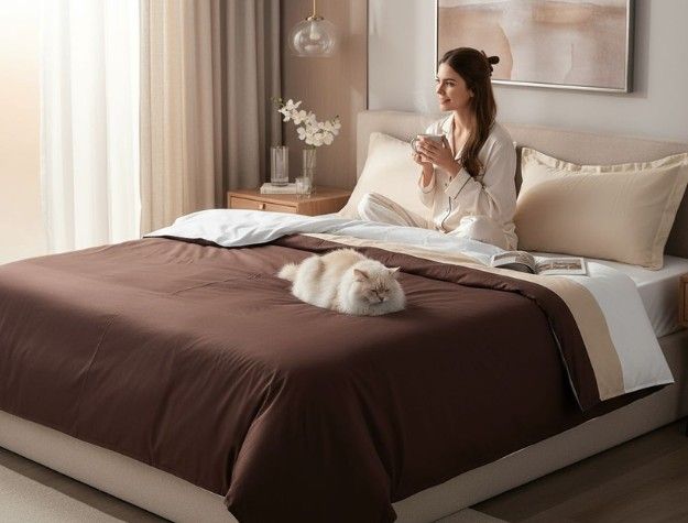 A sophisticated blend of Deep Cocoa Brown, Champagne Beige, and Crisp White. |
